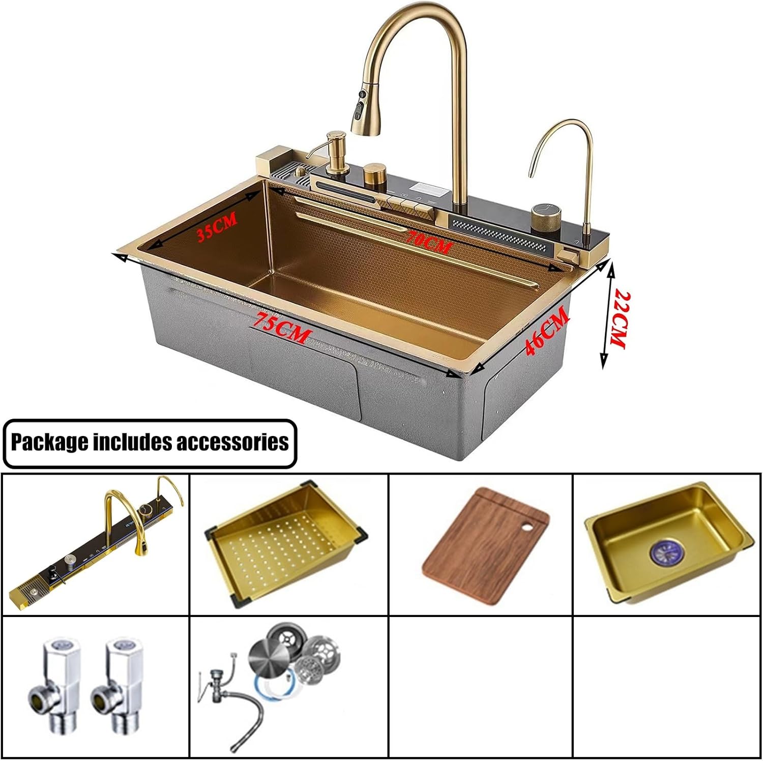 - Accessories: Drain basket, colander, cutting board, soap dispenser