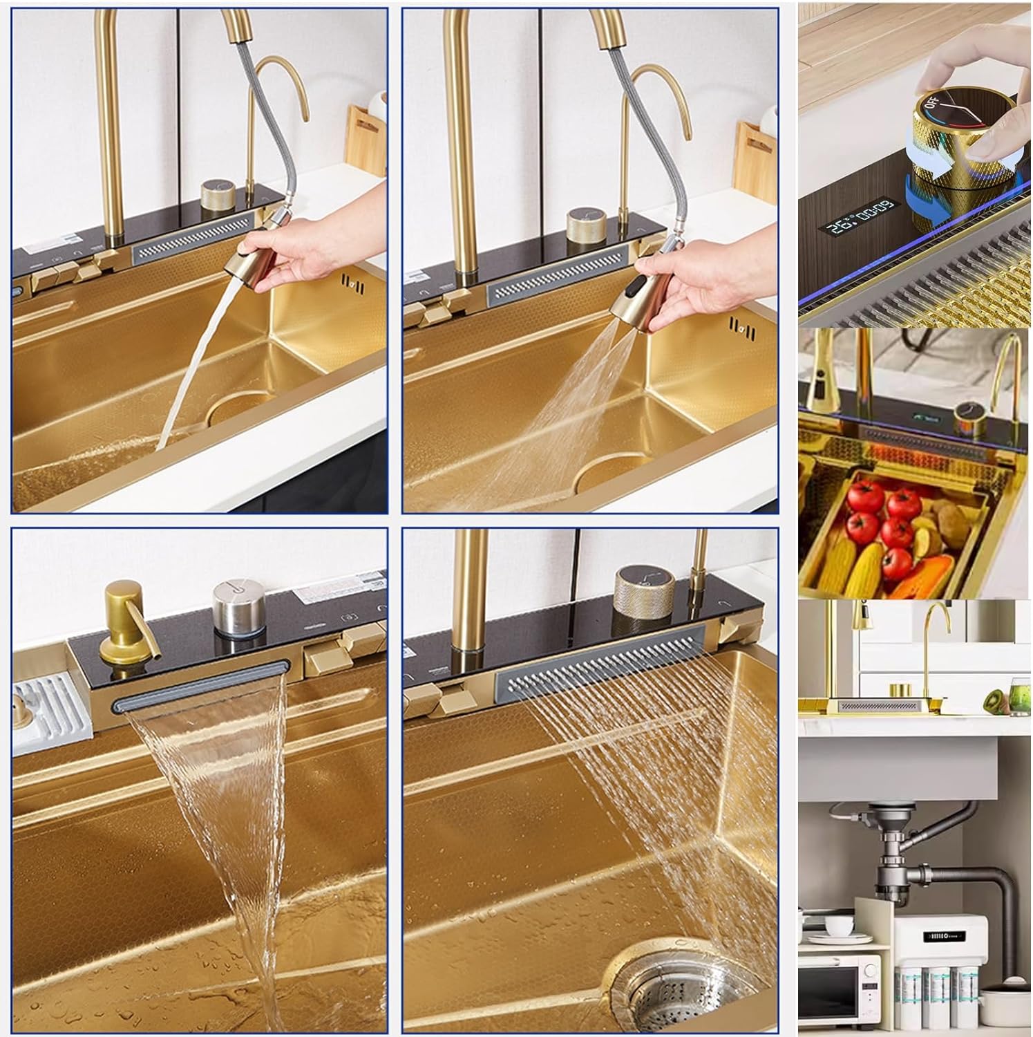 Revolutionize your kitchen with the Golden Multifunctional 304 Stainless Steel Kitchen Sink. This luxury sink combines a sleek golden finish with innovative features, including an integrated smart faucet, to offer unmatched style and practicality. Perfect for modern kitchens, it’s crafted for durability and convenience, elevating your culinary space to a whole new level.