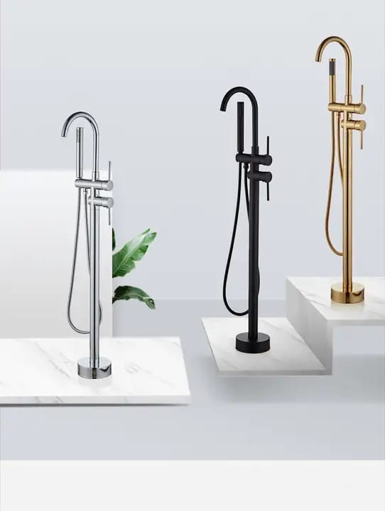The Round Golden Floor-Mount Freestanding Bath Mixer combines timeless elegance with modern functionality, offering a luxurious golden finish and easy-to-use controls for a high-end bath experience.